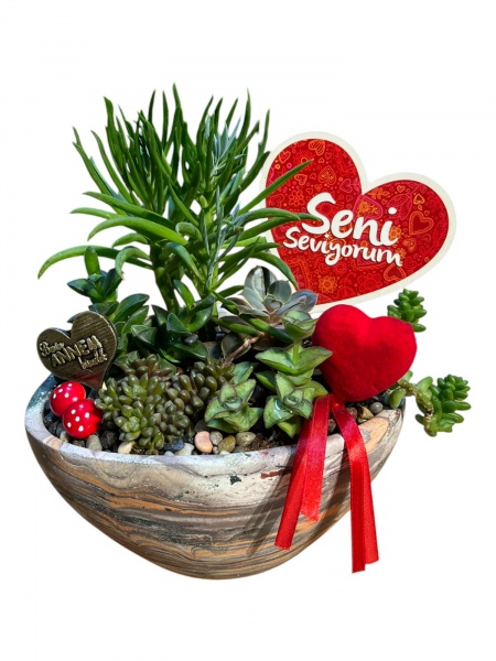Sadelik, huzur ve sevgi dolu bir dokunuş… Bu özel sukulent aranjmanı, içerisinde yer alan kırmızı kalp detaylarıyla anlamlı bir atmosfer yaratıyor. Her detayı özenle düşünülmüş bu tasarım, doğanın yeşiliyle ruhun zarafetini bir araya getiriyor.
